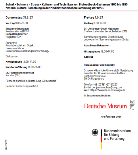 Vom 28.08. bis zum 01.09.2023 organisierten die Kustodie der OVGU und das Deutsche Museum München einen Workshop zum Thema "Basic Collection Techniques" für das Team der Kustodie der OVGU und die Verbund- und Kooperationspartner_innen. Während des dreitägigen Workshops lernten die Teilnehmenden eine Vielzahl von Abteilungen des Deutschen Museums kennen. Für das 3ioS-Team war die Ausstellung "Gesundheit" von besonderem Interesse, durch die es der Kurator Florian Breitsameter persönlich führte.
