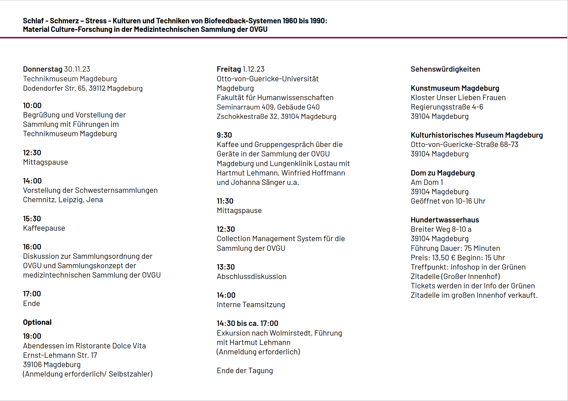 Im November 2023 lud 3ioS Verbund- und Praxispartner_innen nach Magdeburg ein. Der erste Tag fand im Technikmuseum Magdeburg statt. Hajo Neumann führte die Teilnehmenden durch die Sammlung. Es folgten Vorstellungen der eingeladenen Schwestersammlungen und eine Diskussion des Sammlungskonzepts der Historischen Medizintechnischen Sammlung.