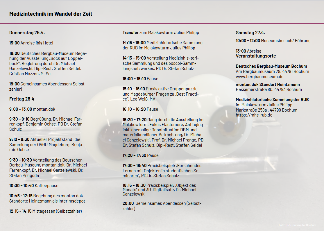 Vom 25.4.2024 bis zum 27.4.2024 fand in Bochum der Workshop "Medizintechnik im Wandel der Zeit" statt, der gemeinsam von der Kustodie der OVGU Magdeburg, dem Institut für Medizinische Ethik und Geschichte der Medizin der Ruhr-Universität Bochum und dem Deutschen Bergbaumuseum Bochum organisiert wurde. Im Deutschen Bergbau Museum besuchte das 3ioS-Team die Sonderausstellung "Bock auf Doppelbock", in deren Zentrum der berühmte Förderturm des Museums stand. Außerdem stellten Michael Farrenkopf, Michael Ganzelewski und