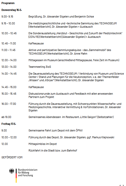 Alexander Sigelen führte in zwei Werkstattberichten in die Sammlungen des Technoseums ein. Anne Mahn stellte das "Sammelmobil" des TECHNOSEUM vor. Für das 3ioS-Team war Alexander Sigelens Bericht über die Ausstellung "Herzblut. Geschichte und Zukunft der Medizintechnik", die Sigelen einige Jahre zuvor kuratiert hatte, von besonderem Interesse. Seine Erfahrungen werden für die Ausstellungsaktivitäten von 3ioS eine große Hilfe sein.