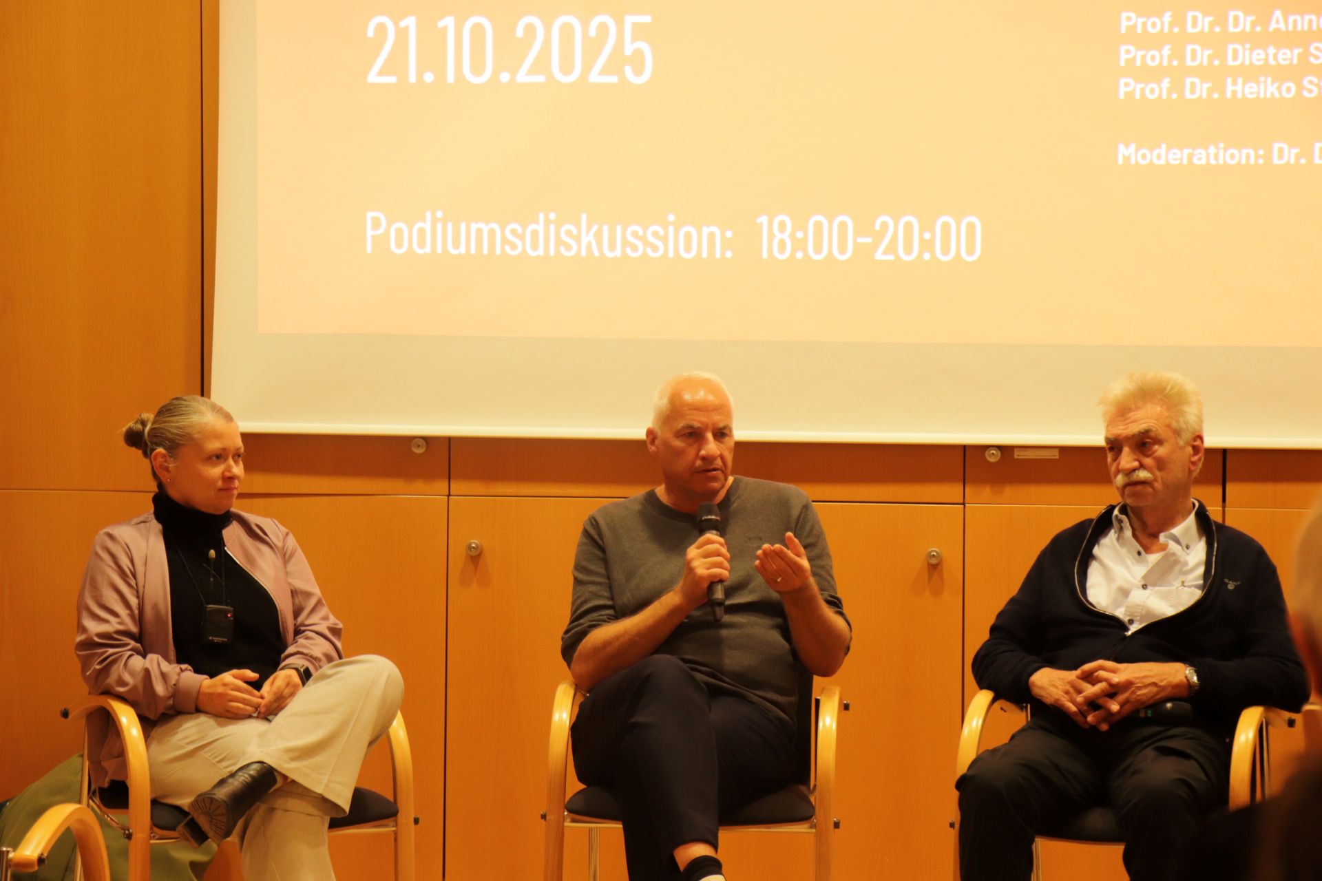 Nach der Ausstellung gab es die spannende Podiumsdiskussion "Symptome von Stress, Stress als Symptom. Historische, sozialwissenschaftliche und medizinische Perspektiven". Unsere Gäste waren Prof. Dr. Dr. Anne Albrecht (Institut für Anatomie der Universität Magdeburg), Prof. Dr. Heiko Stoff (Institut für Ethik, Geschichte und Philosophie der Medizin, Medizinische Hochschule Hannover) und Prof. Dr. Dieter Seefeldt (Facharzt für Psychosomatische Medizin und Psychotherapie).